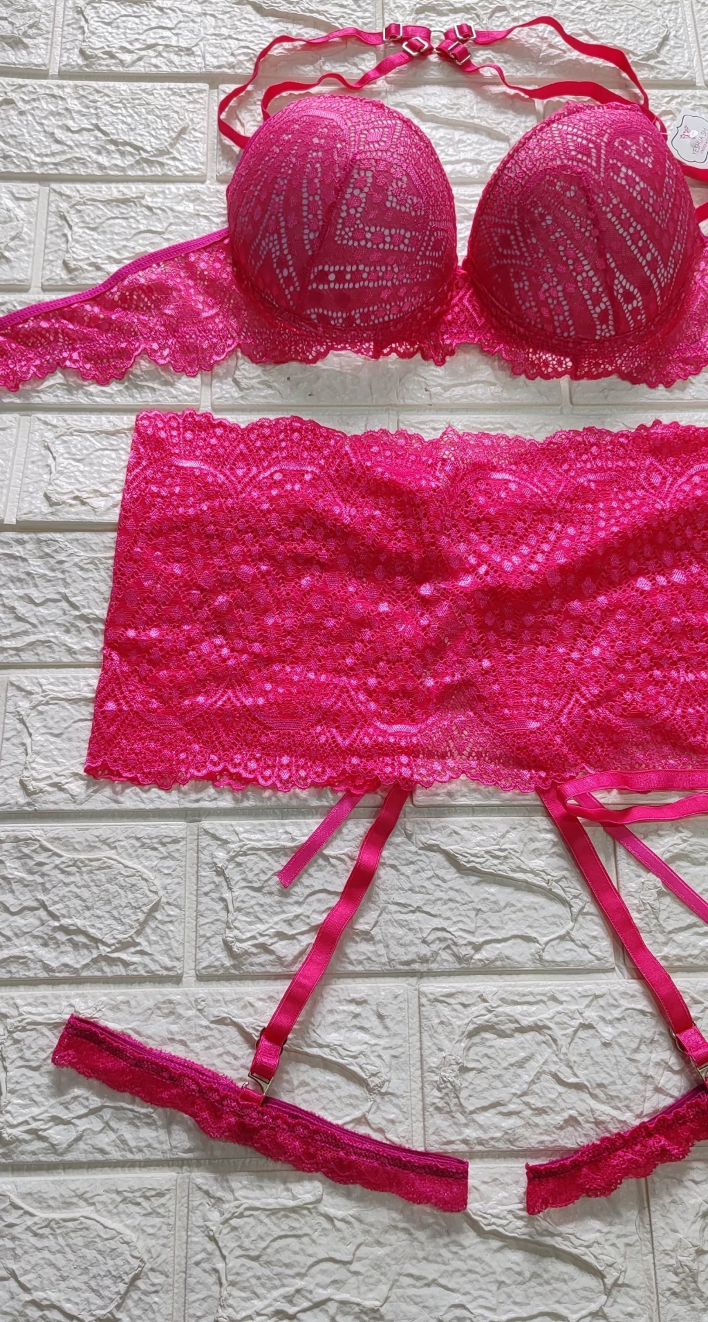Conjunto de 3 piezas diseñado pensando en la comodidad y sensualidad. Incluye un corpiño taza soft que proporciona soporte sin sacrificar la comodidad. El hilo o colaless es regulable, permitiendo un ajuste personalizado para asegurar un ajuste perfecto. La pollerita portaligas es el toque final, con un entrelazado en la parte trasera que no solo sirve para ajustarla a la medida, sino que también añade un detalle atractivo. Todo el conjunto está confeccionado en puntilla, lo que le da un toque delicado y sexy.